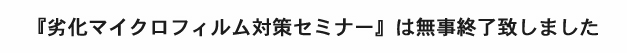 5/27(金)、文京区シビックセンターに於いて行われた『劣化マイクロフィルム対策セミナー』は無事終了致しました。 ご参加頂きました皆様に心より御礼を申し上げます。 今後ともマイクロフィルムの修復に関して新しい情報をご提供すべく、精進して参ります。何卒宜しくお願い申し上げます。 取り急ぎ、御礼及びご報告とさせて頂きます。 「劣化マイクロフィルムを救う」連絡会事務局(株式会社 吉岡映像)